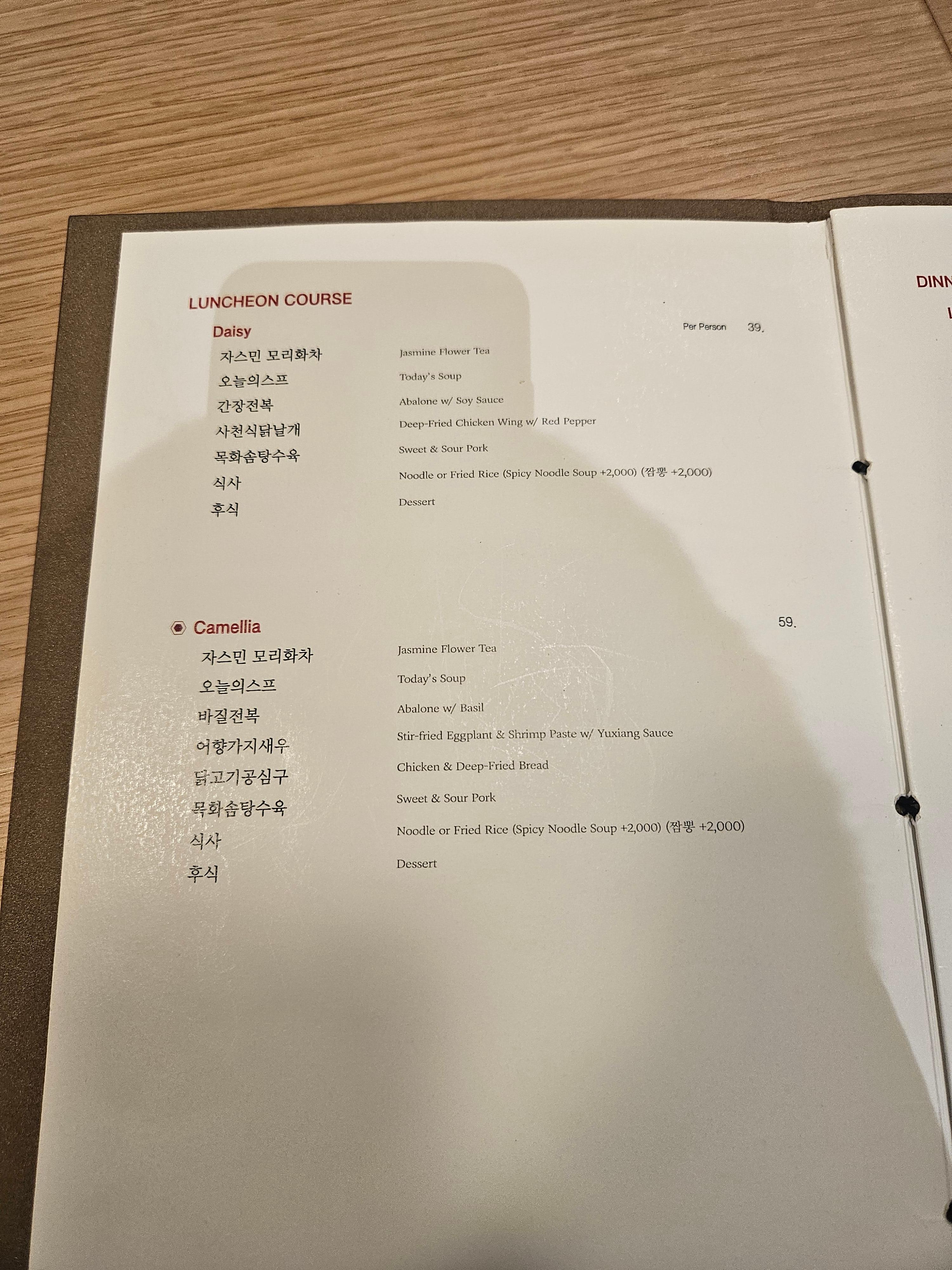 메뉴판. 코스도 살짝 고민해보다가 단품으로 먹기로 결정. 점심코스는 가격이 약간 무리한다 하면 먹을만할듯 하다.