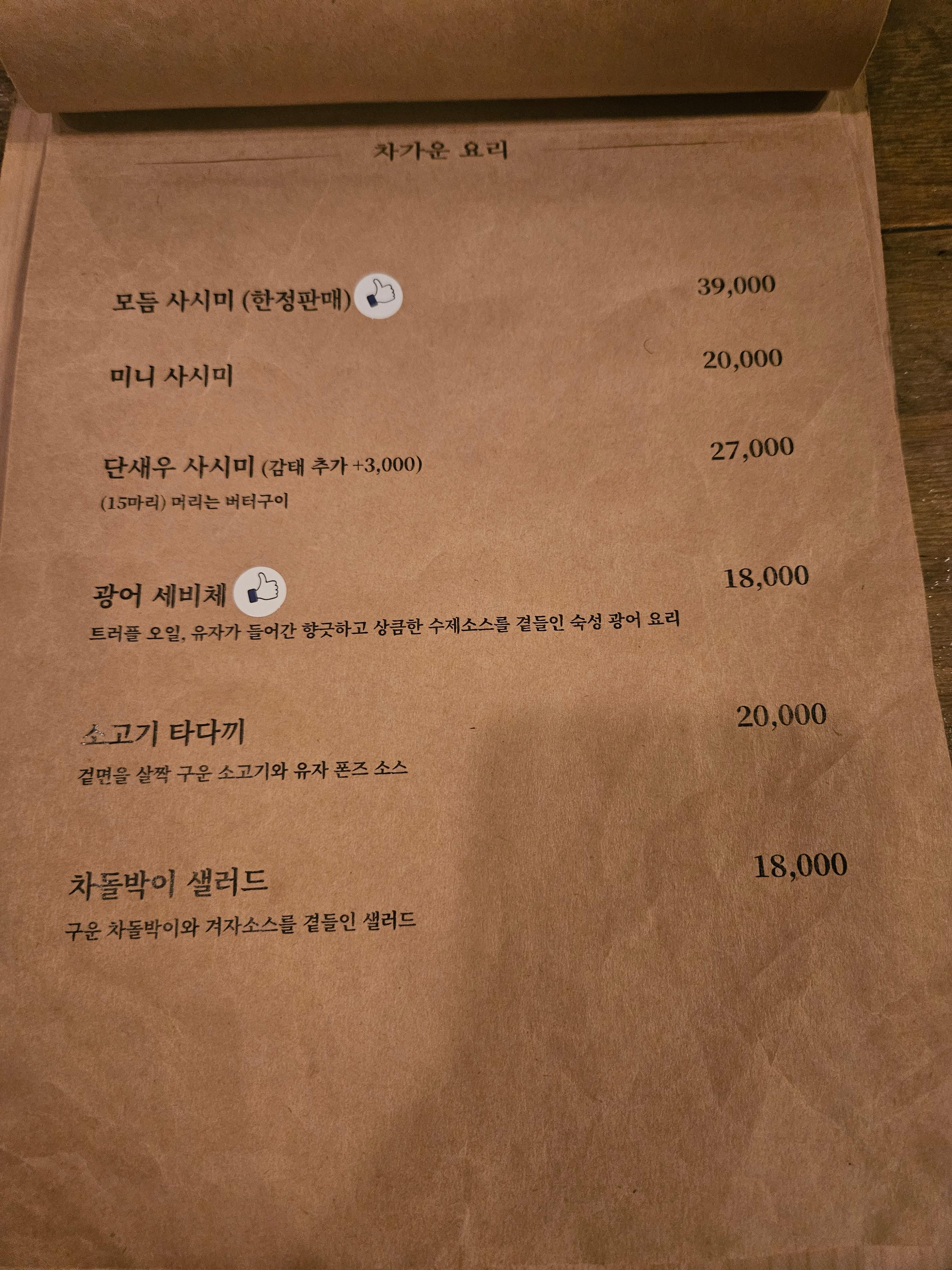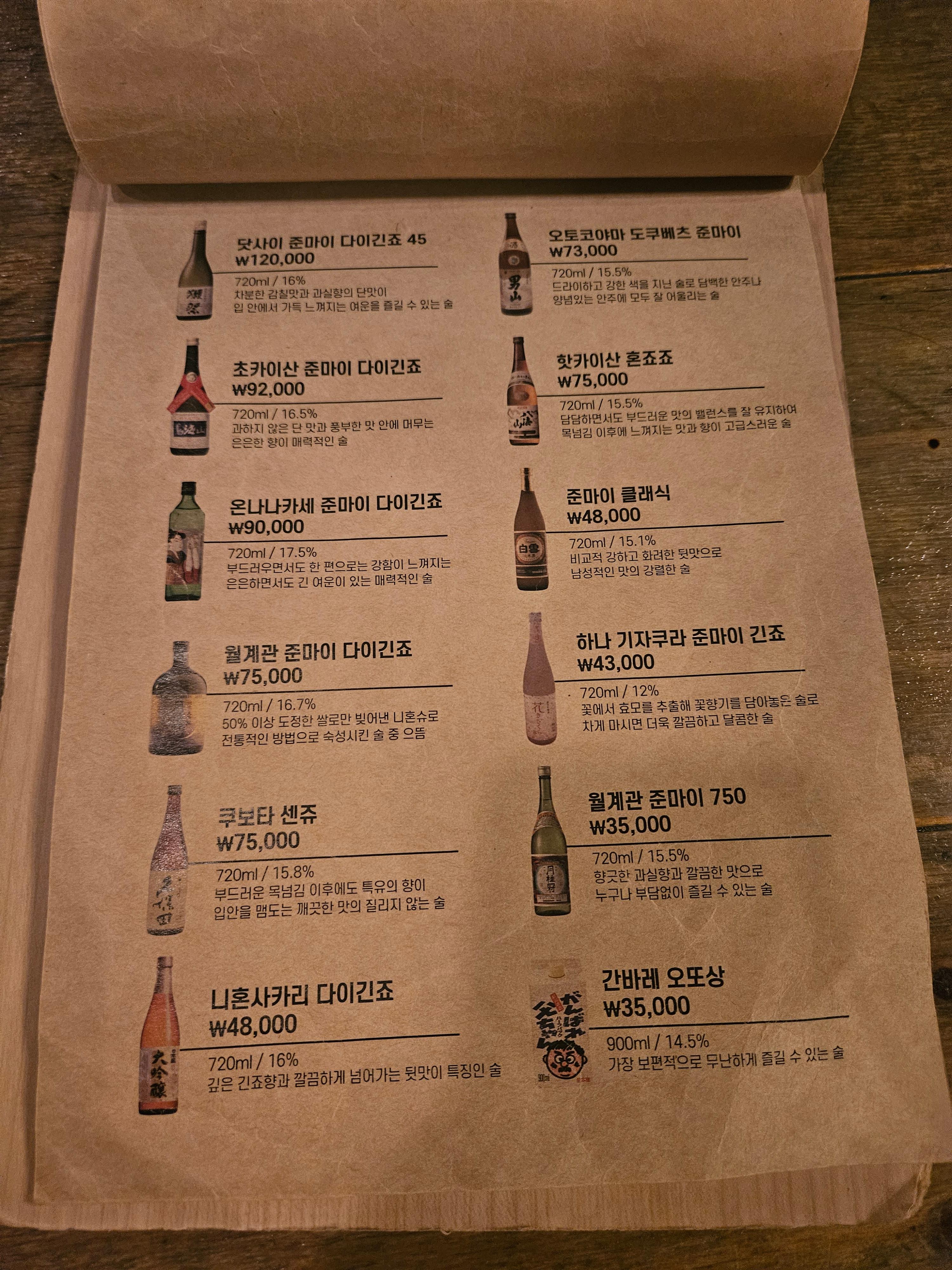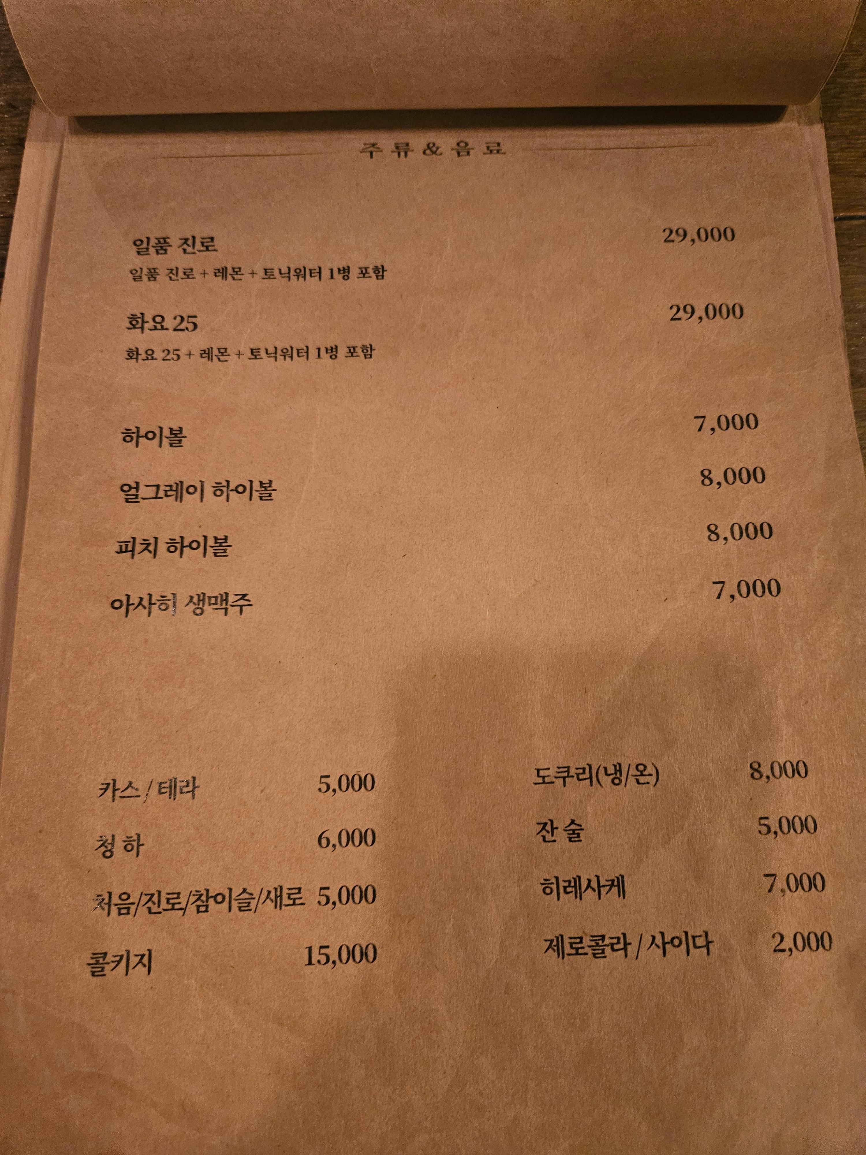 술 메뉴판. 콜키지도 가능! 하지만 여기 따로 술 가져오는사람을 본적은 없는 것 같다.