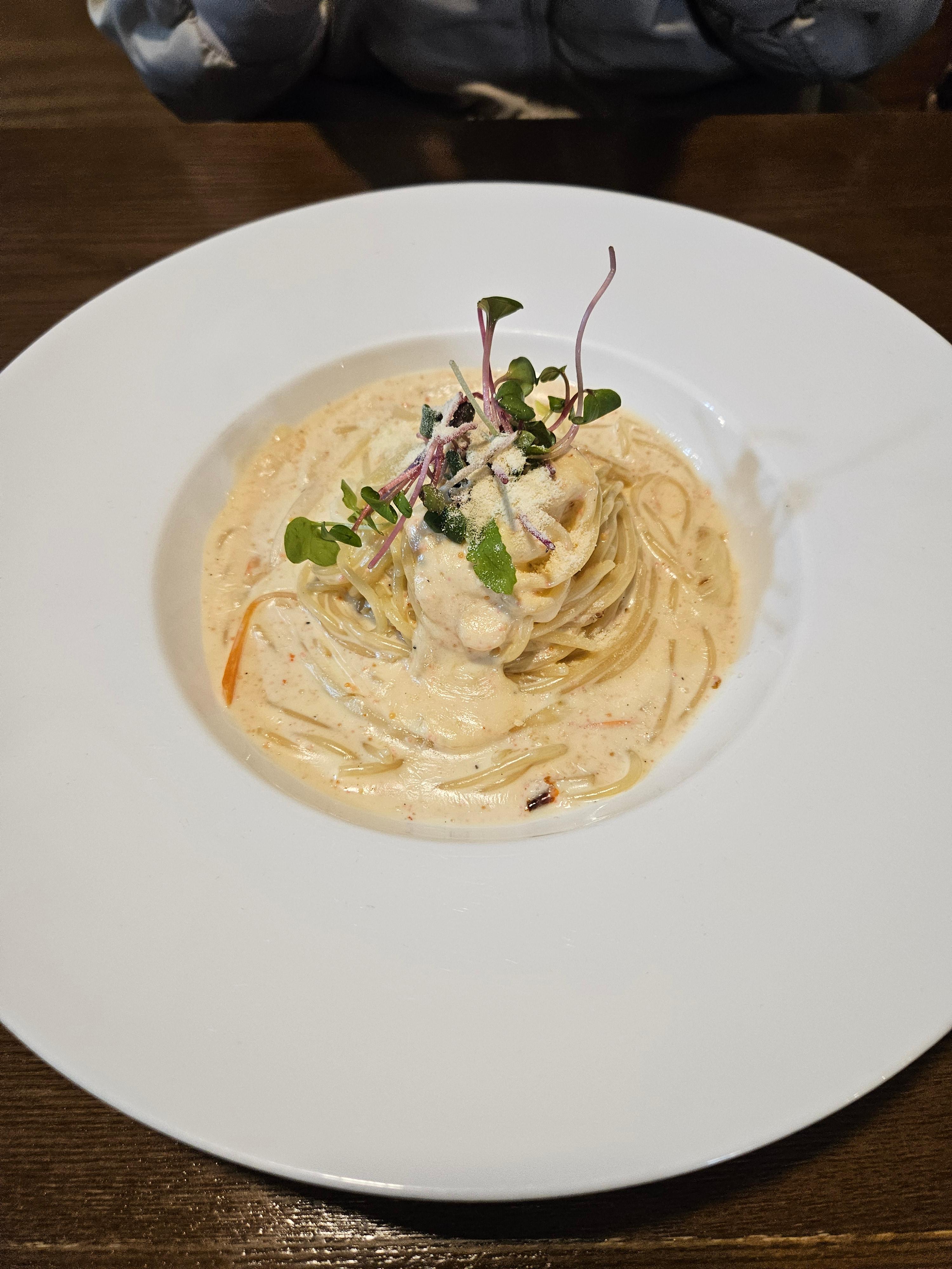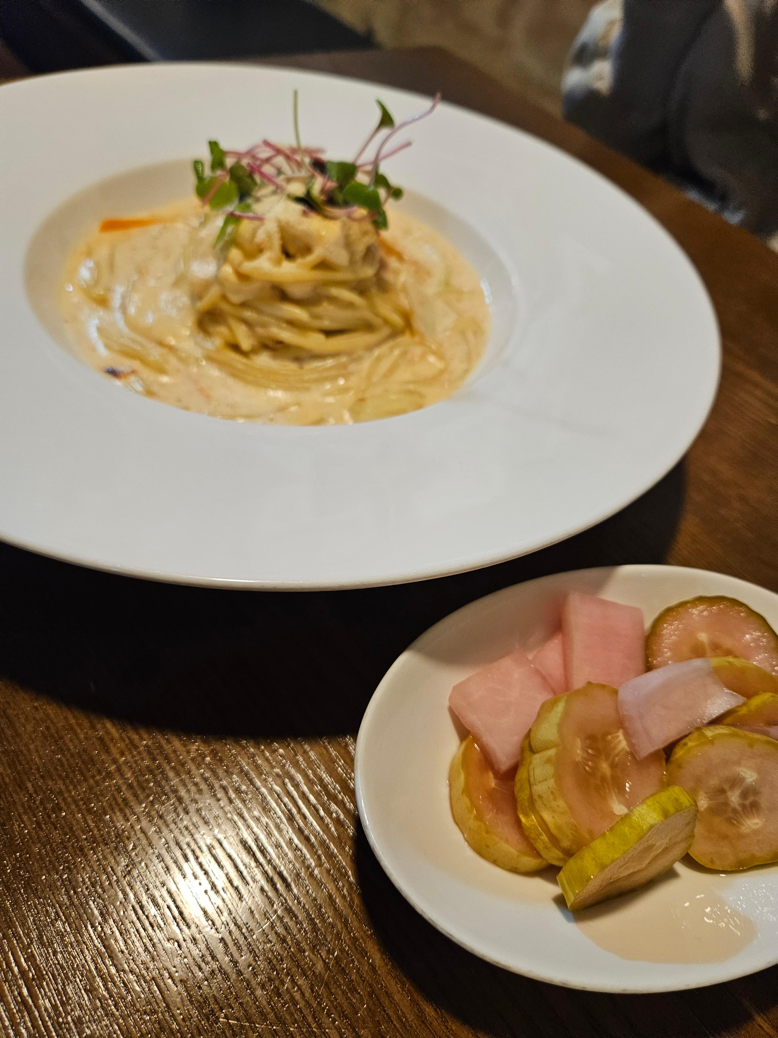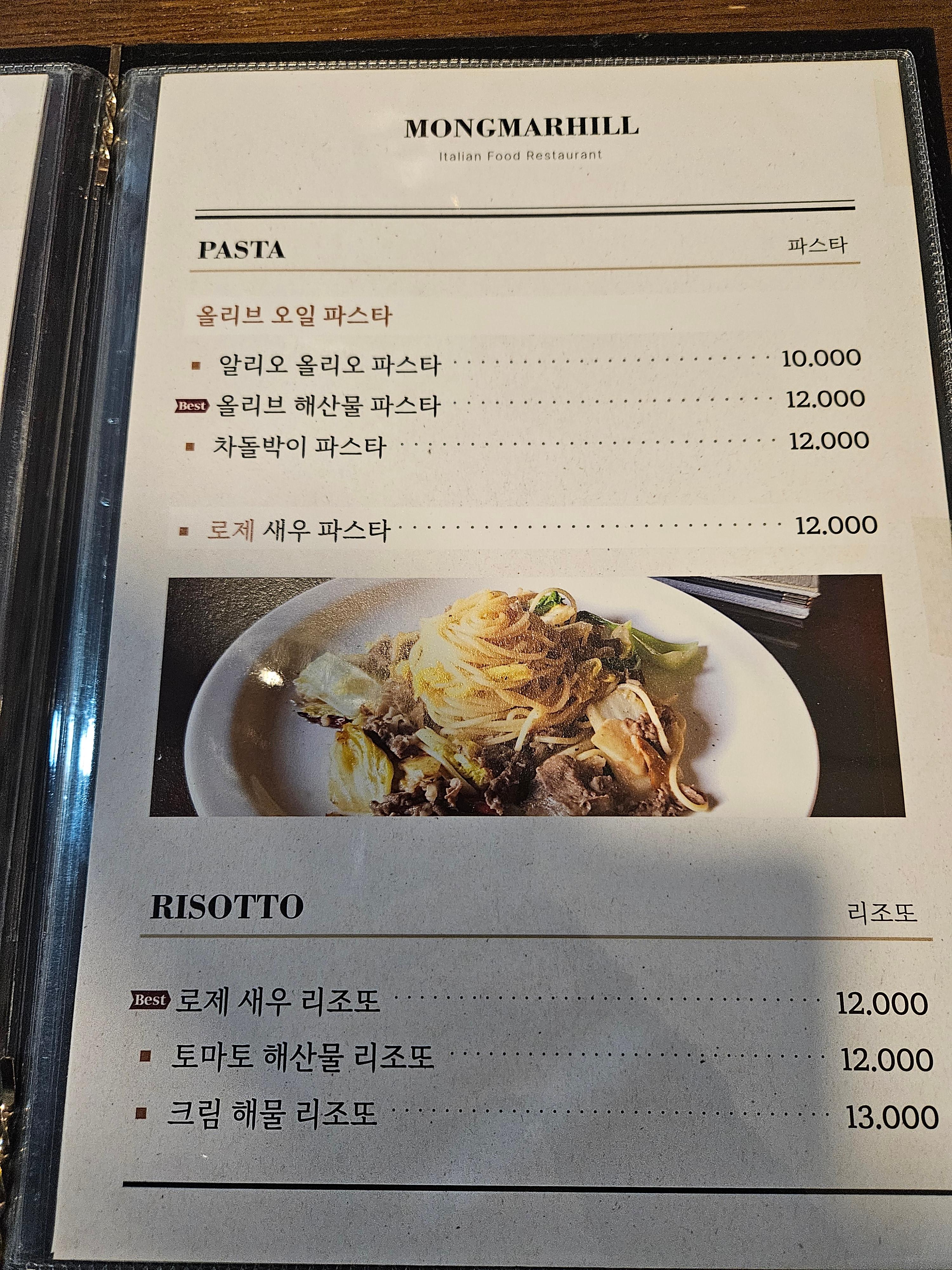 음식 사진이 벽에 있는데, 저 고객의 요청으로 재판매하는 크랩 날치알 통게살 파스타가 정말 맛있다.