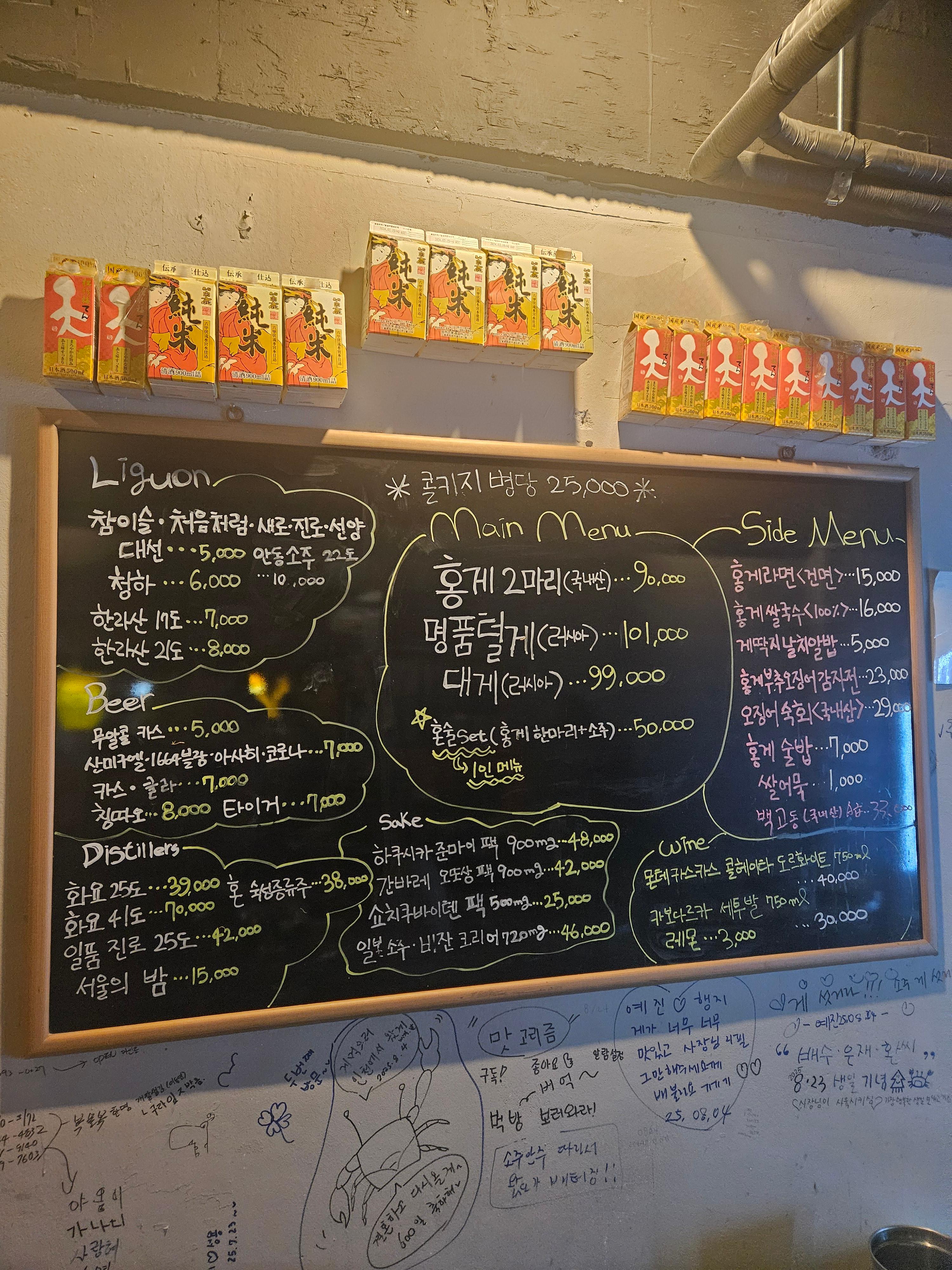 메뉴판. 기본적으로 2인당 홍게2마리를 주문하는편인듯 하다. 인당 기본 5만원정도는 깔고가는집. 가격이 싸진 않다. 처음에는 속초에서 먹었던 수율 정말 안나오는 그런 홍게 생각하면서 거기서 몇마리 서비스로 받는 그런 홍게를 2마리에 9만원이나? 라고 생각했는데 실제로 메뉴가 나오고는 확실히 다르다고 느꼈다. 홍게 살이 꽉찬느낌.