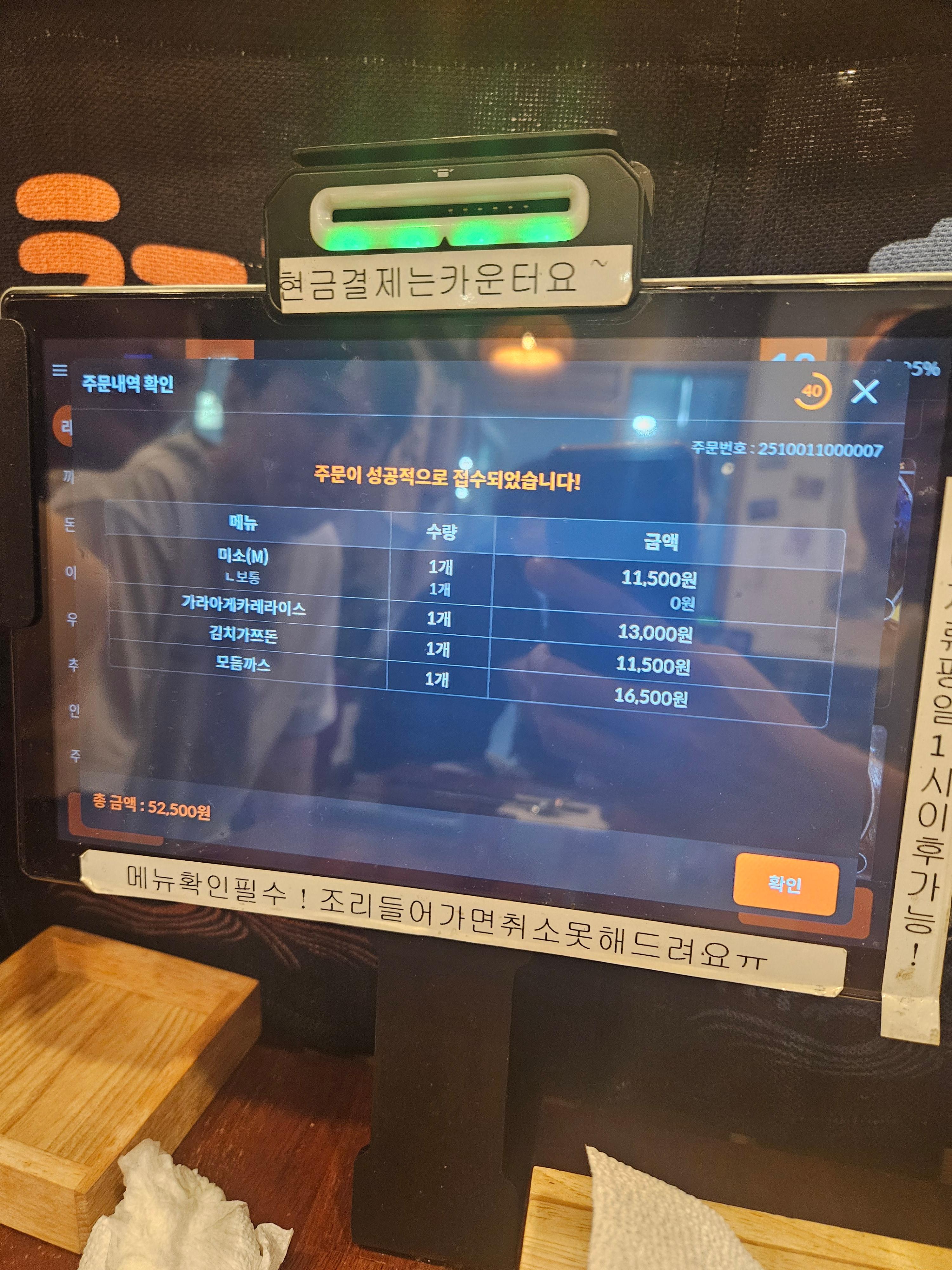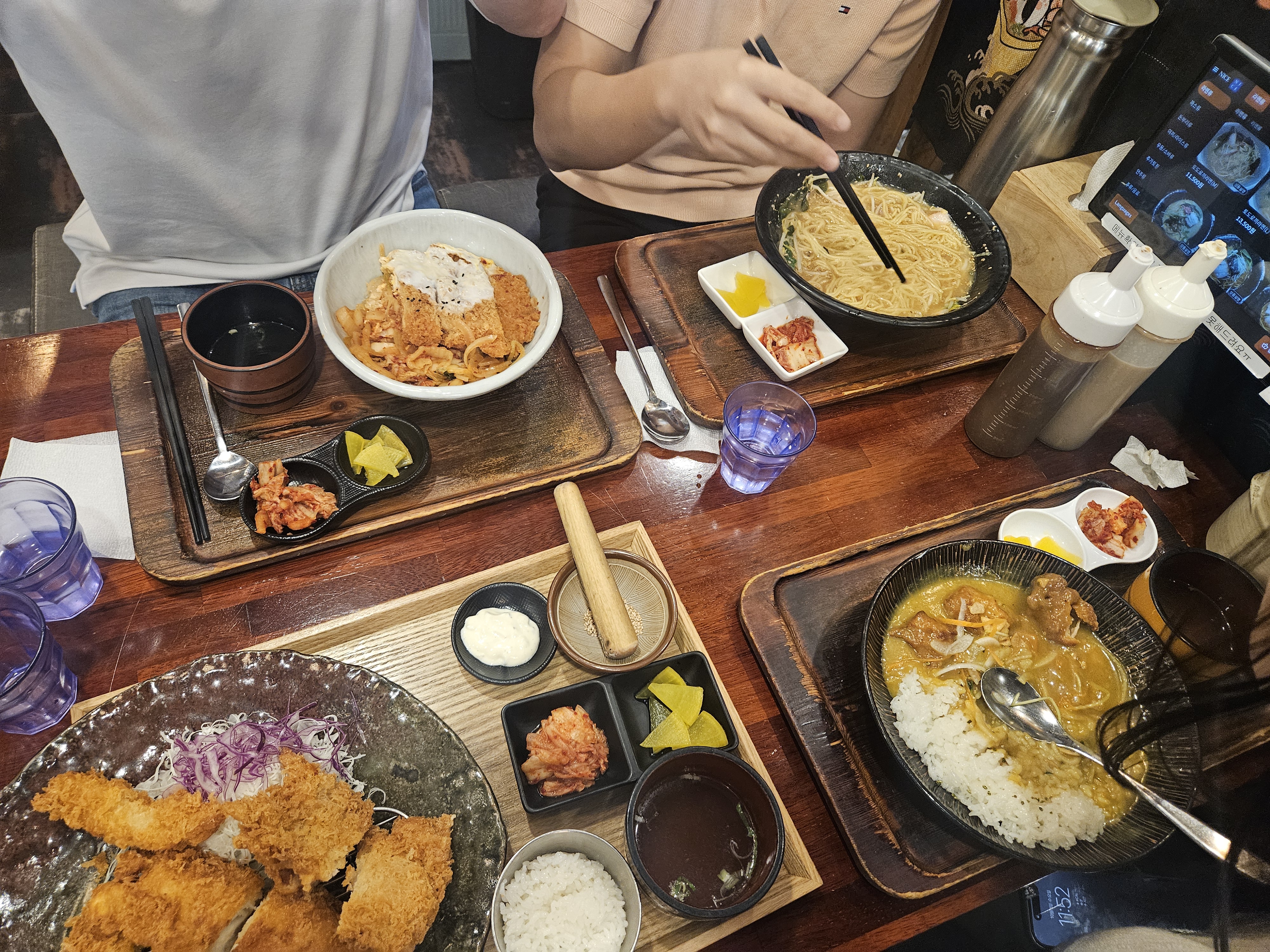 요기도 테이블에서 주문하고 결제까지 하는 방식. 요즘 결제까지 테이블에서 하는곳들이 꽤나 늘어났다. 4인 모임으로 각자 취향대로 주문. 역시 돈까스가 들어간 메뉴가 인기가많다. 여기가 돈까스 잘하는 곳이라 대부분 주변사람들도 돈까스위주로 주문한다.