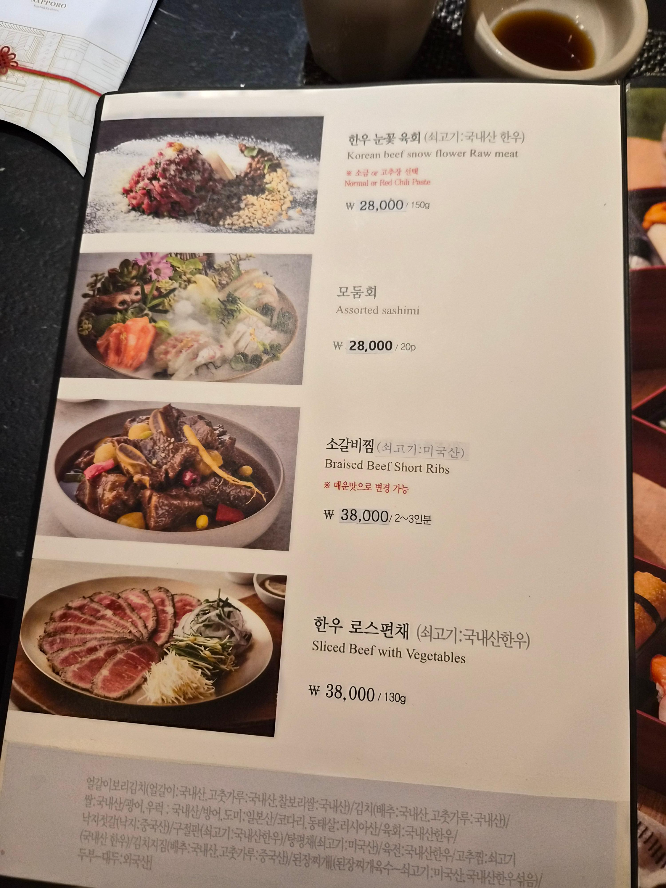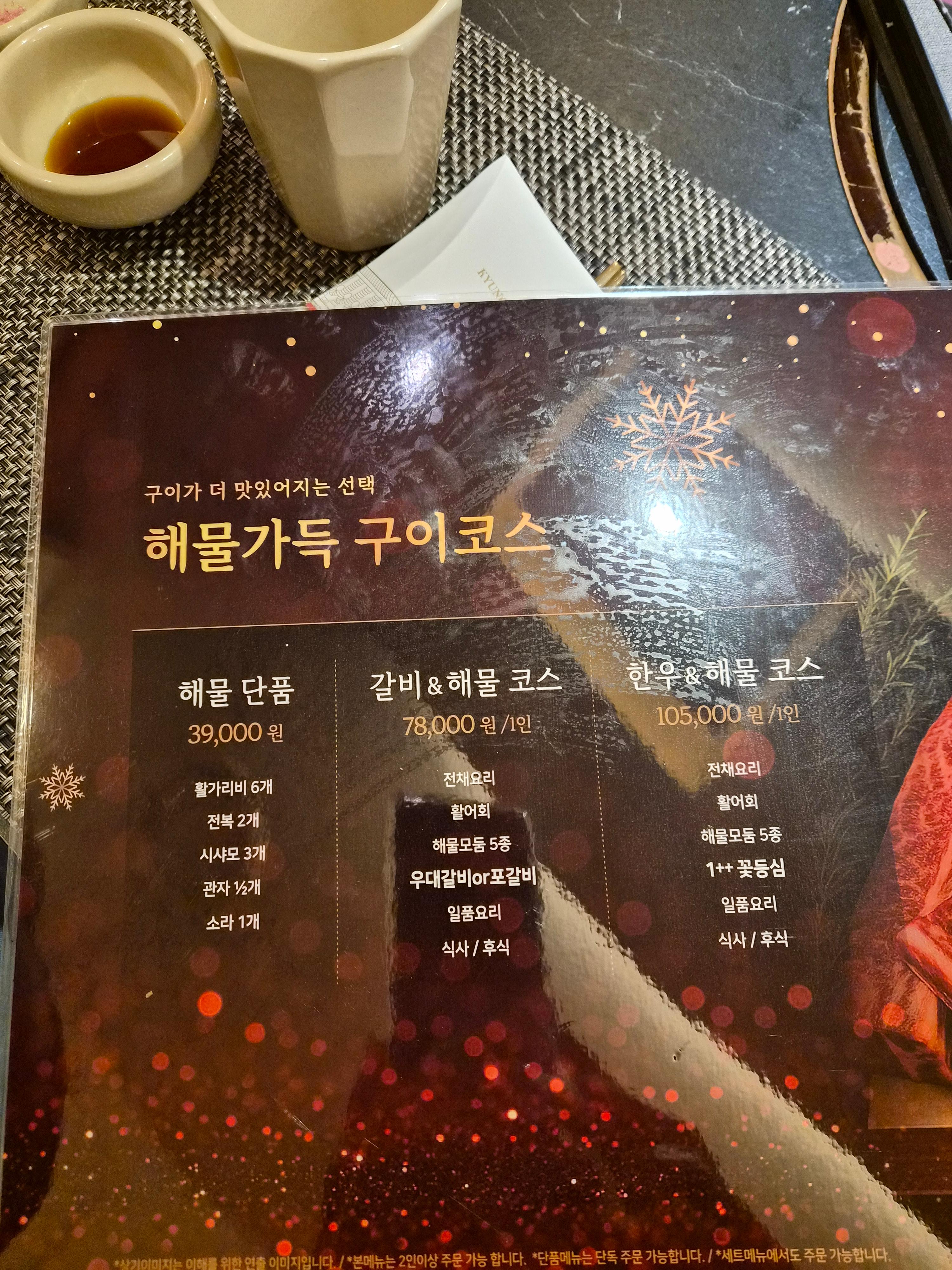 연말 코스요리를 판매해서 우리는 한우&해물 코스 105,000원/인 을 골랐다. 술도 화요+맥주 화맥으로 시작했지만 먹다가 중간에 와인으로 변경.