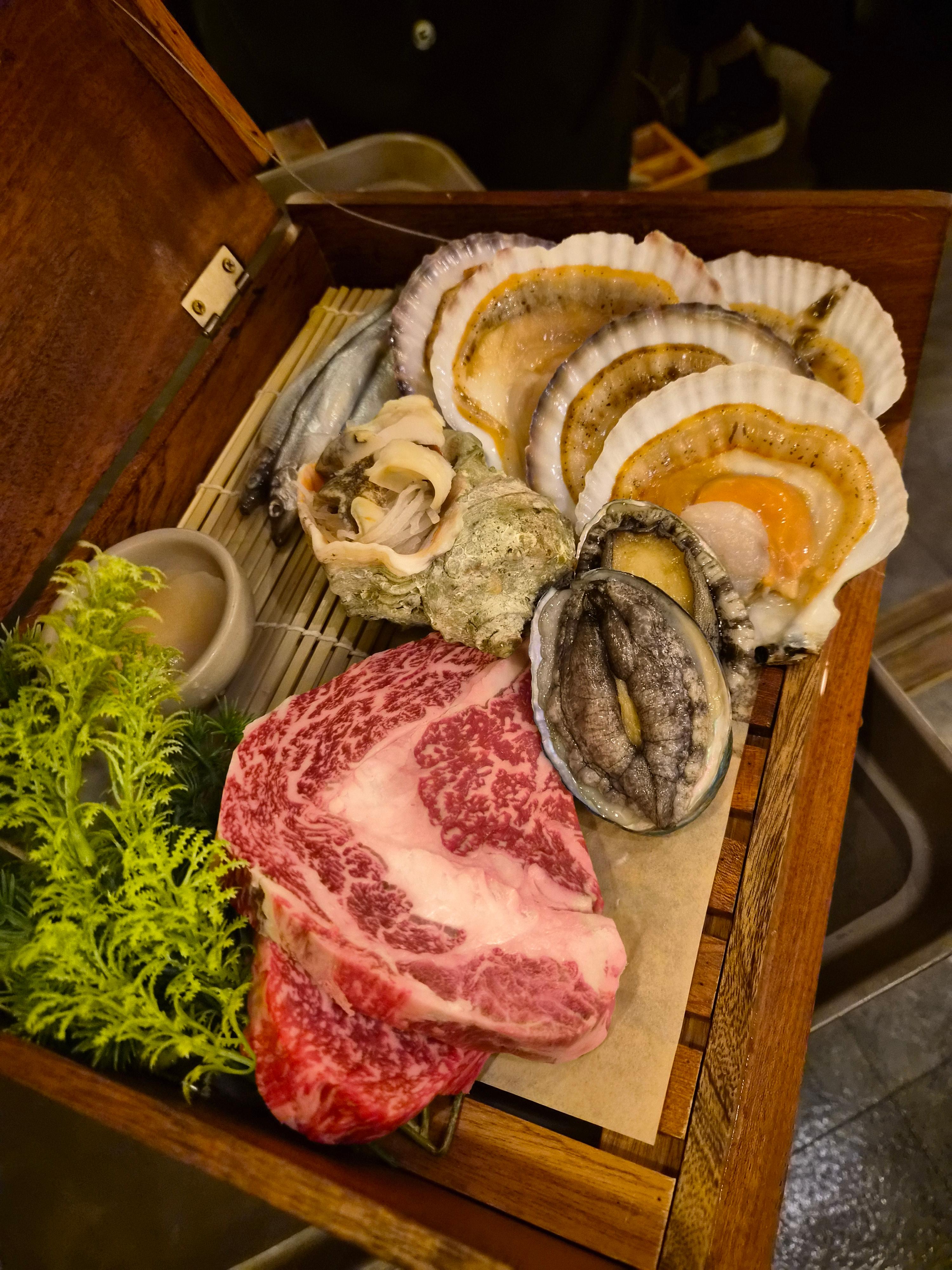 새우살과 알등심? 인것 같고 가리비 전복 소라 등이 같이 나왔다. 아마 기억에 작은 생선(시샤모같음)도 나왔었는데, 생각보다 판에 들러붙어서 먹기가 조금 어려웠다