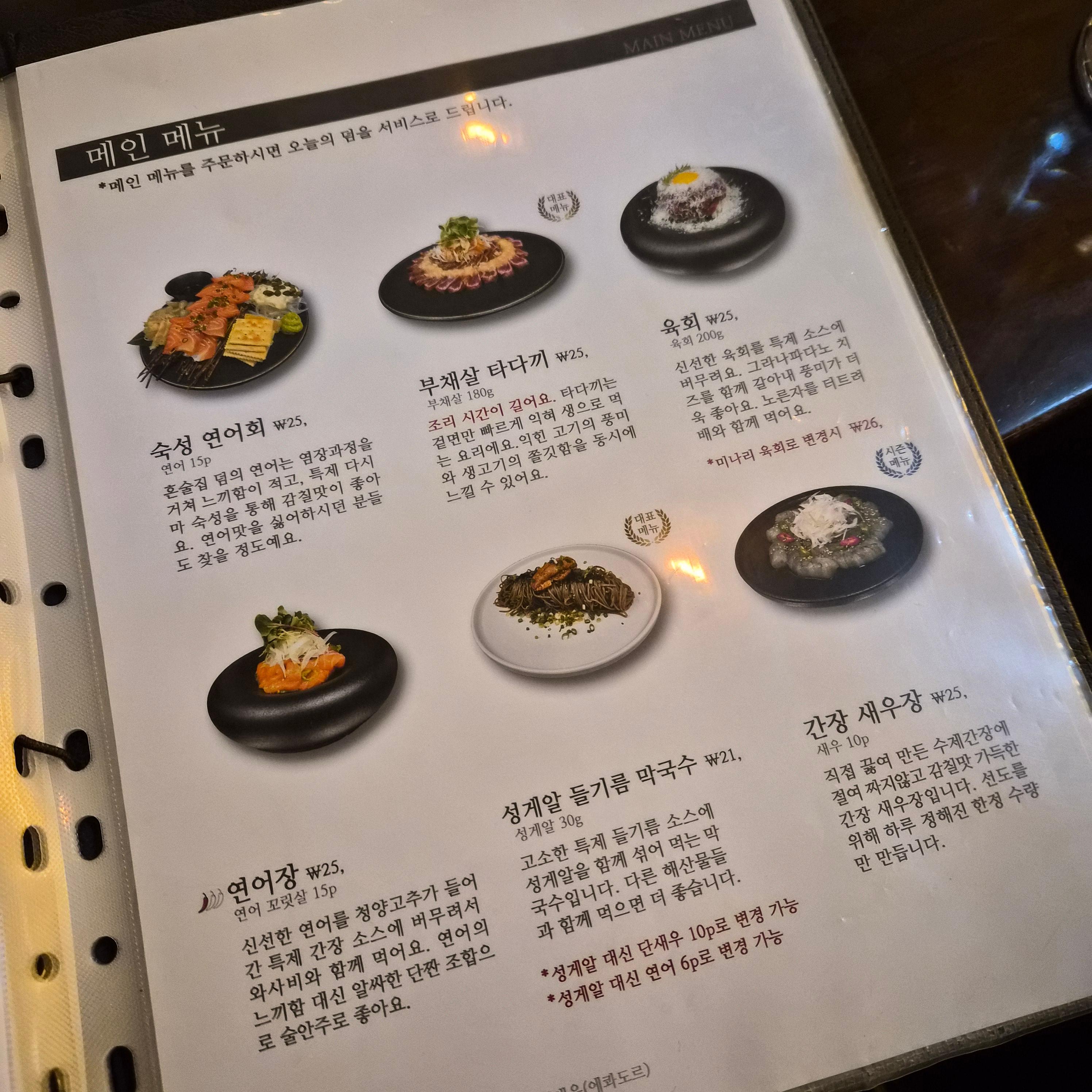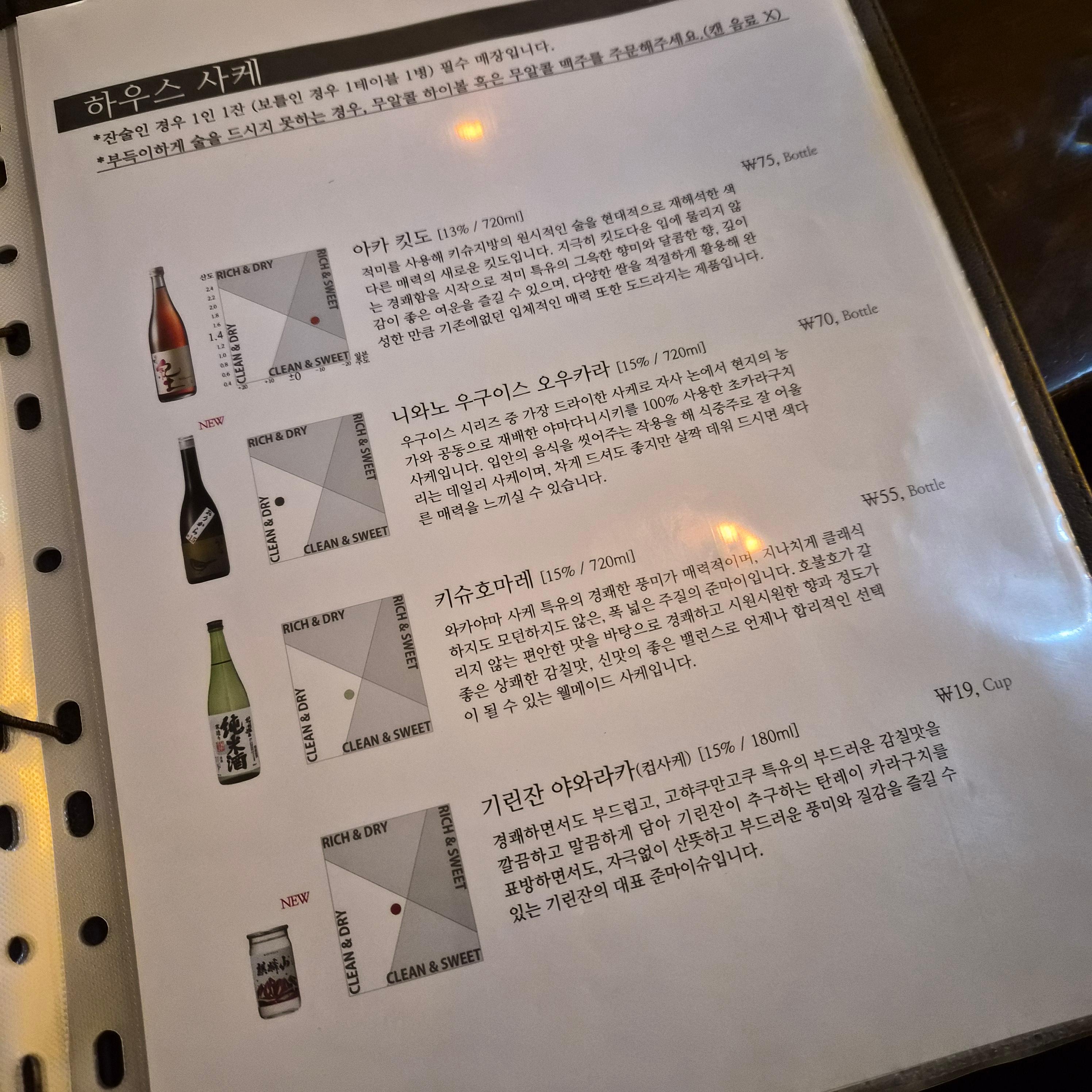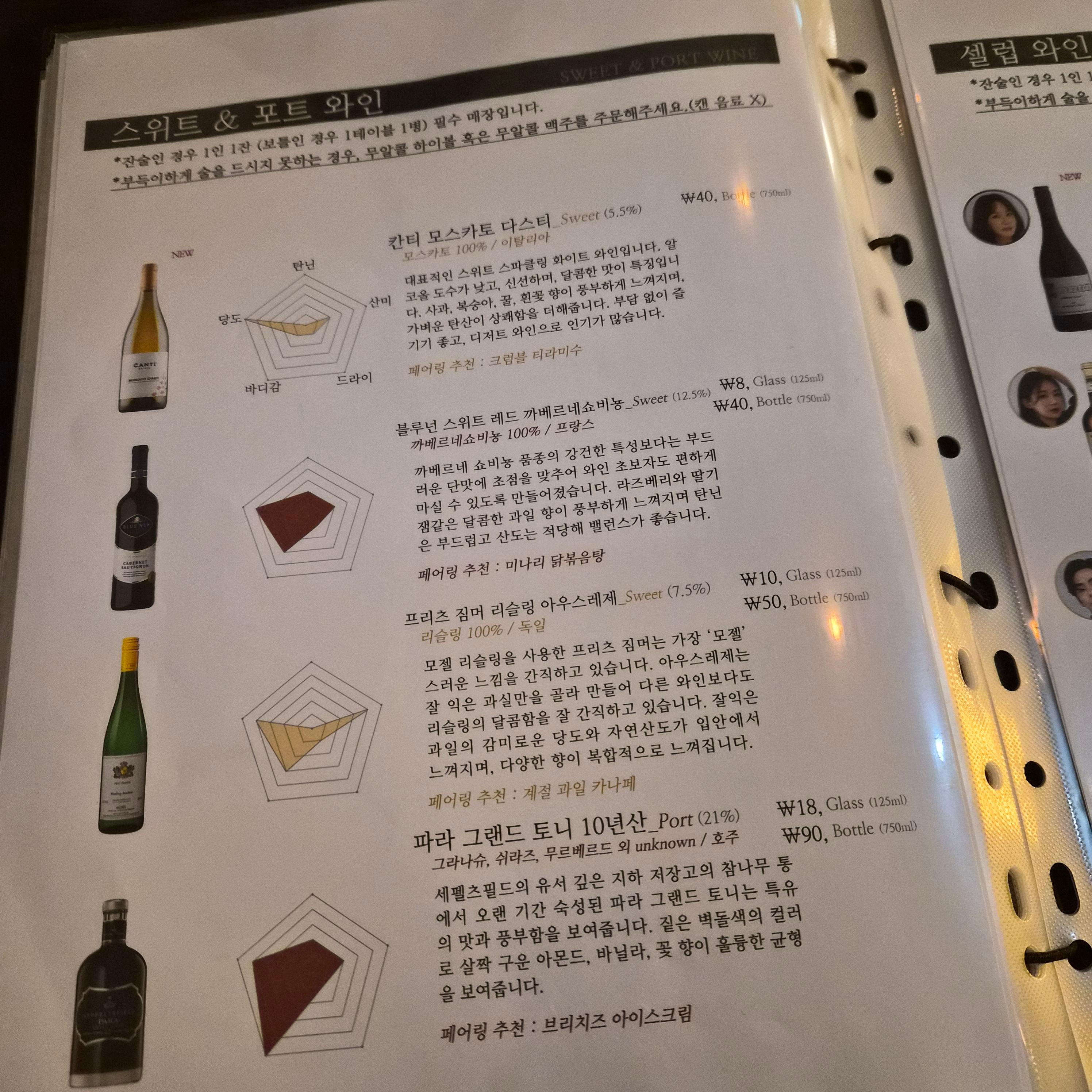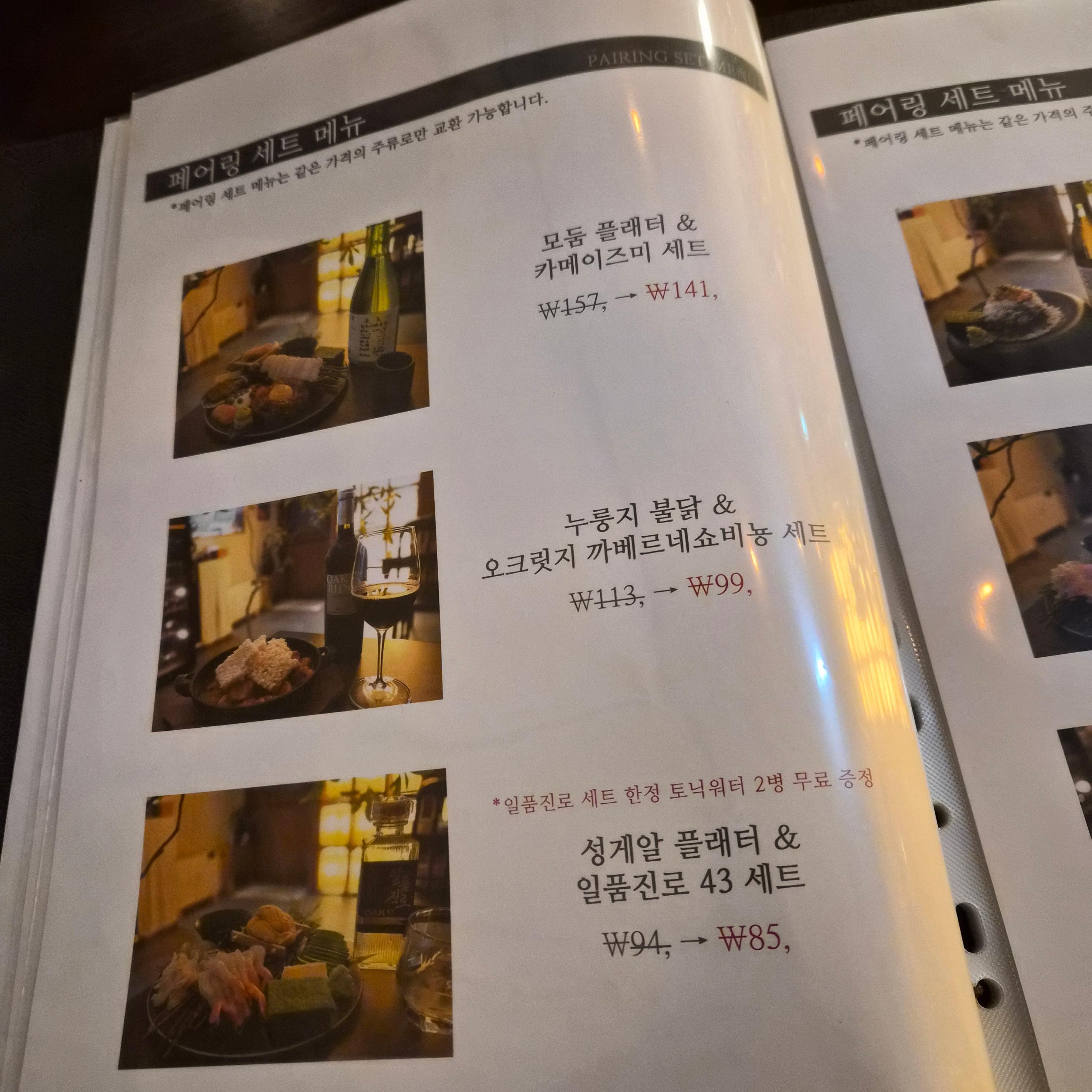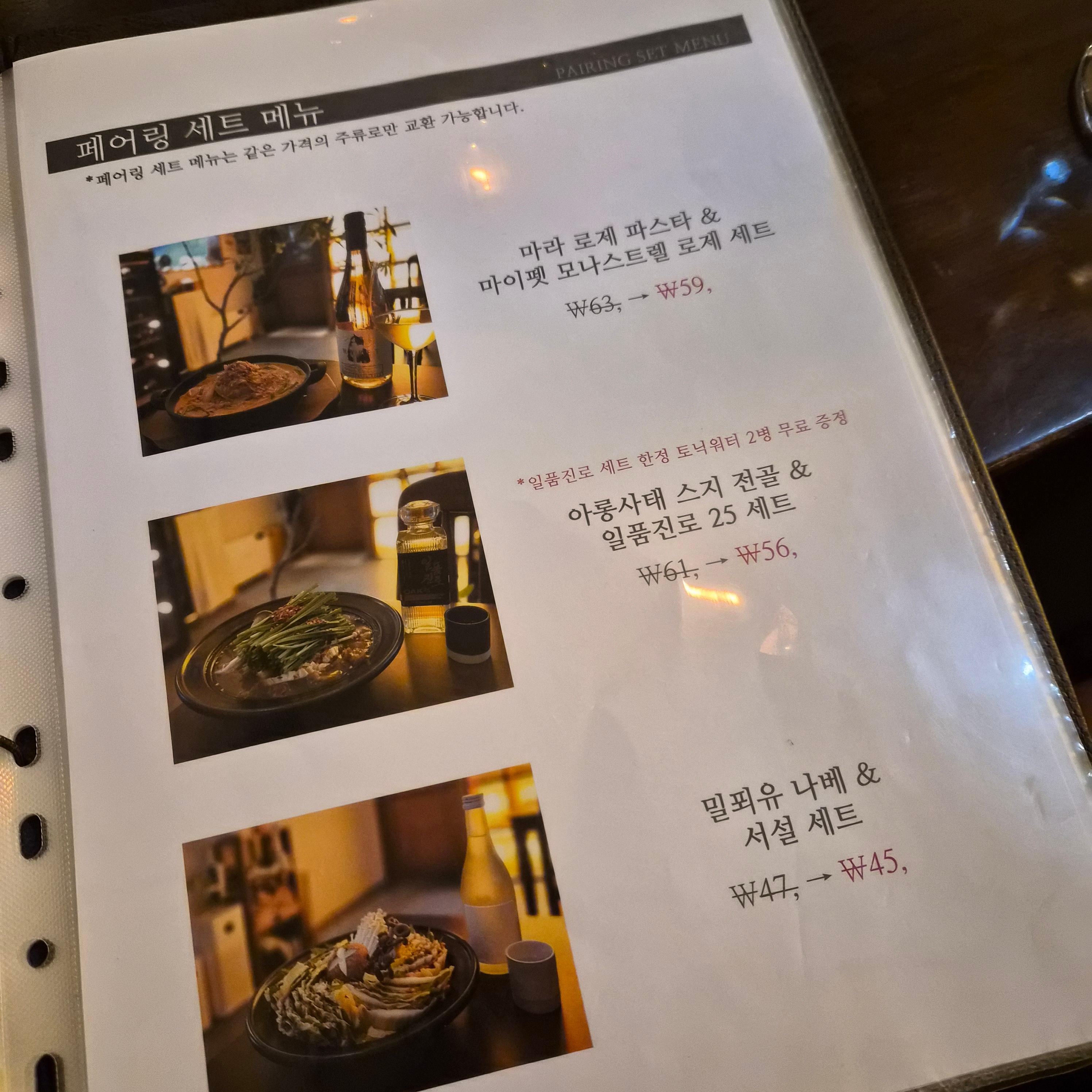 술 종류가 정말 많다. 와인류는 특히 페어링하기 좋은 음식까지 추천해준다. (콜키지도 가능)