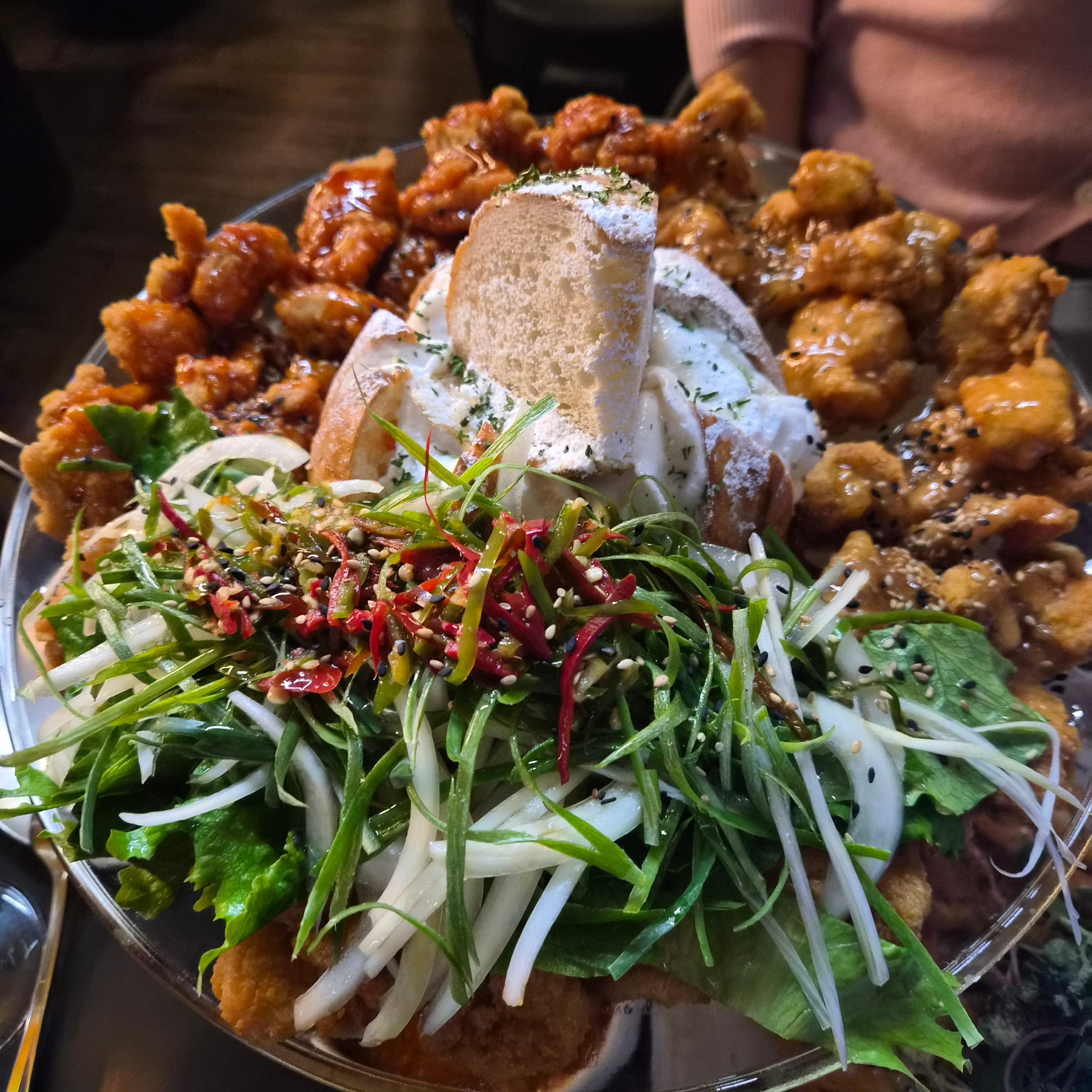 여기 제일 잘나가는 메뉴 중 하나인 피코치킨(3가지맛) (27,900) 치킨이 딱딱하거나 튀김만 있지 않고 속이 촉촉하고 맛있었다. 특히 개인적으로는 유린치킨? 파닭같은게 정말 맛있었다.