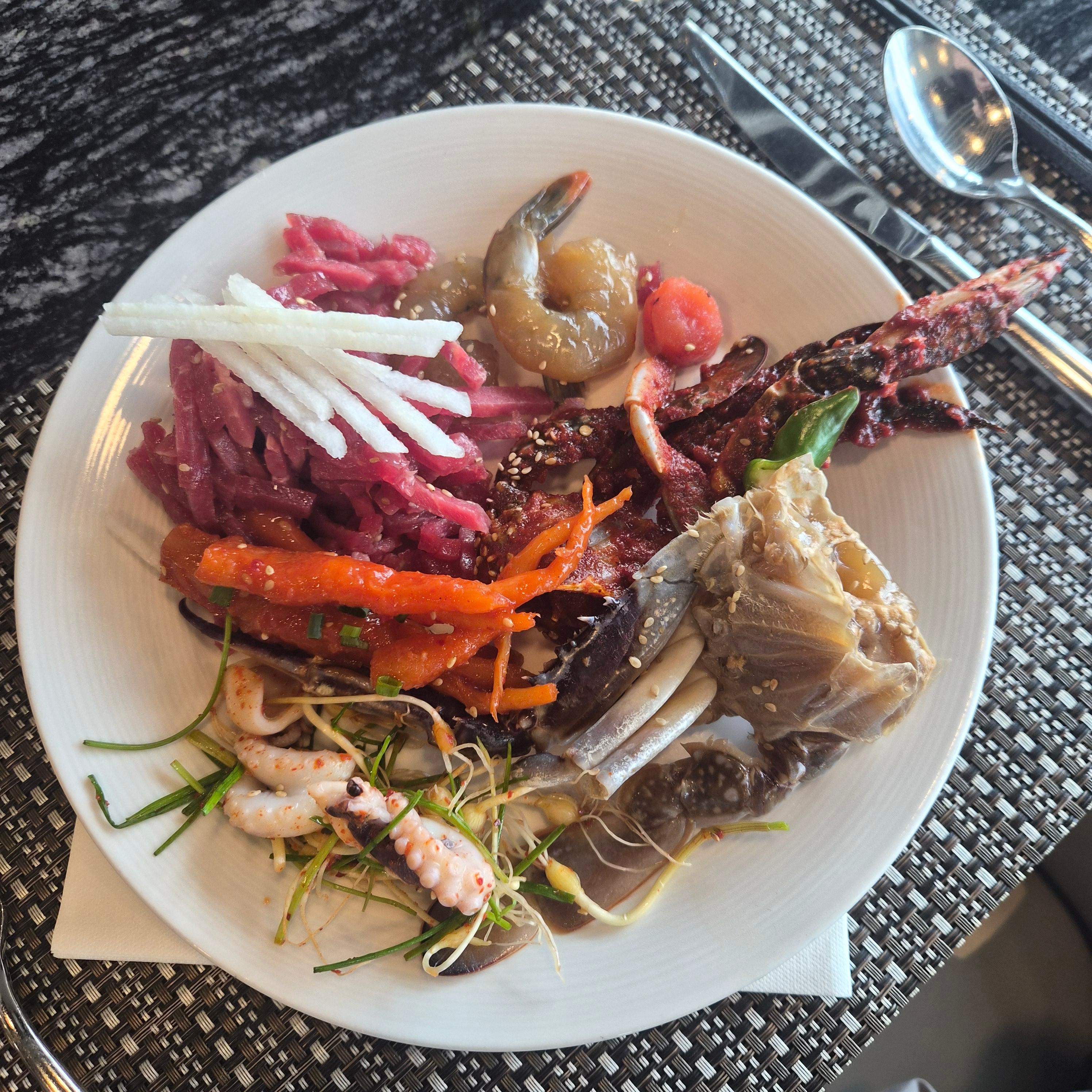 우선 첫 번째 접시는 한식샐러드쪽 코너에서 가져온 게장들과 육회 등등... 게장이 밥이 좀 필요하긴 했는데 다음접시를 위해 참고먹었다. 간장게장은 그리 짜지 않아서 괜찮았다. 양념게장도 밥이랑 먹으면 꽤 맛있을 것 같다.