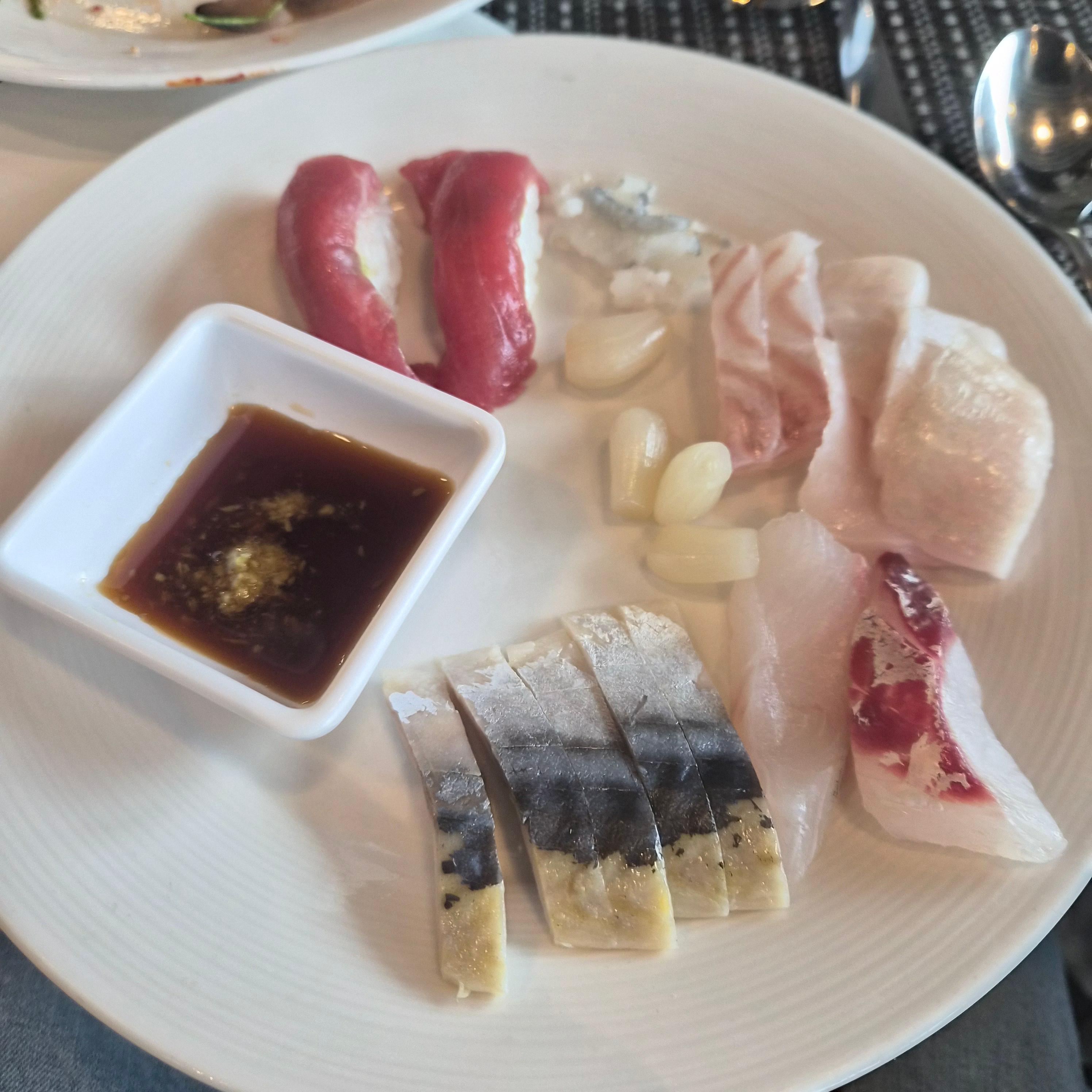 빠르게 두번째 접시. 초밥류와 회 등이 조금씩 있었는데, 개인적으로 참치초밥 말고는 조금 별로였다. 광어는 지느러미 식감을 좋아해서 지느러미 위주로 가져다 먹기는 좋았는데, 뭔가 활어의 식감도 아니고, 숙성회의 꼬소함도 아니고... 잘 모르곘다.